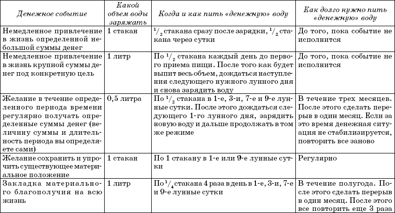 | Способ привлечения денег «Заряжаем воду энергией богатства» Налейте в стакан чистую воду. Для ритуала можно использовать дистиллированную, талую или кипяченую воду. Сядьте поудобнее и поставьте стакан воды перед собой, либо возьмите стакан в руку. Расслабьтесь и закройте глаза. Представляйте картинки, которые ассоциируются у вас с богатством, финансовым процветанием и изобилием.