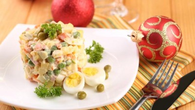 Сегодня по-прежнему популярный салат «Оливье» стал более демократичным по составу, но главная идея осталась неизменной. Классикой жанра был и остается салат «Оливье» с курицей, рецепт которого достаточно прост в исполнении. Куриное филе (300 г.) отвариваем в подсоленной воде и режем небольшими кубиками. Точно также поступаем с вареным картофелем (2 шт.), морковью (2 шт.), яйцами (4 шт.), луковицей и двумя солеными огурцами. Смешиваем все ингредиенты в глубокой салатнице, добавляем 200 г. зеленого горошка и рубленый укроп. Солим по вкусу, сдабриваем майонезом (250 г.), тщательно перемешиваем – замечательный новогодний салат готов.